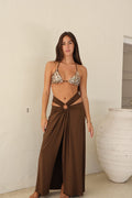 Crafted in a rich macchiato brown, the smooth, lightweight fabric flows beautifully over swimwear or styled with a minimal top for elevated resort dressing.
